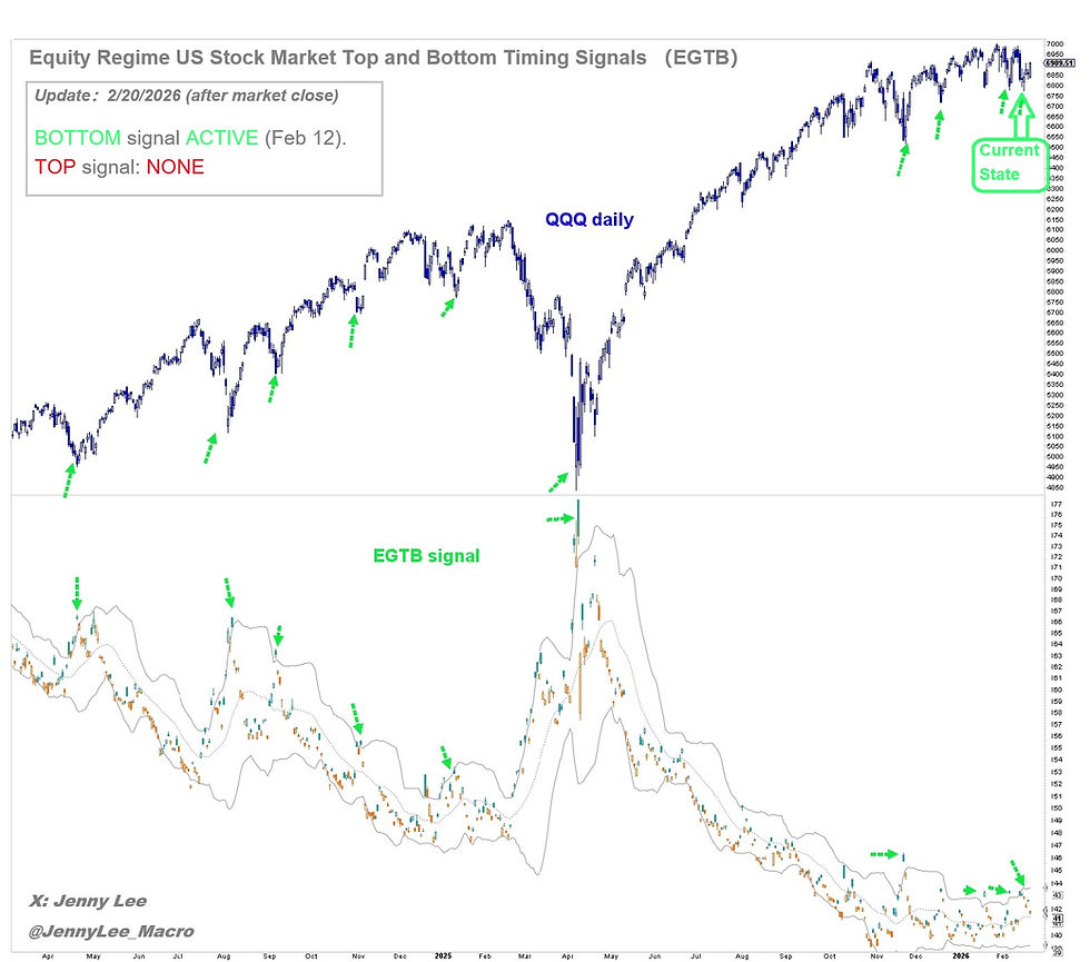 The EGTB bottom signal triggered on Feb 12 remains active, with no top signal confirmed. Price behavior continues to validate the classification of the current environment as re-calibration within an intact structural advance.